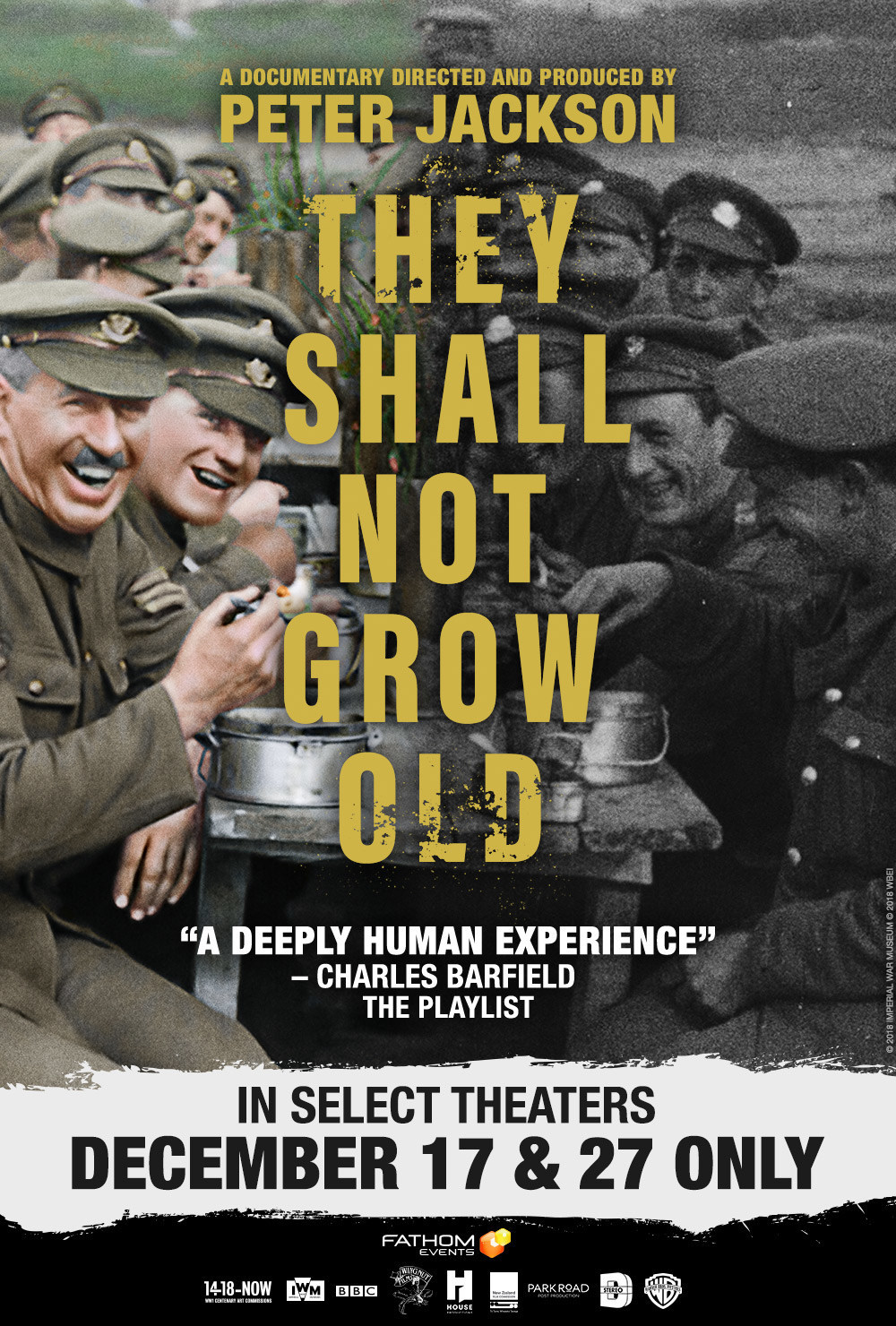 Encore screenings of “They Shall Not Grow Old” are scheduled for Thursday, December 27. “They Shall Not Grow Old” is distributed worldwide by Warner Bros. Pictures. The film, by Academy Award®-winning director Jackson, restores, colorizes and applies 3D technology to original film footage from World War I – and The New York Times says, “The result is a transformation that is nothing less than visually astonishing.”